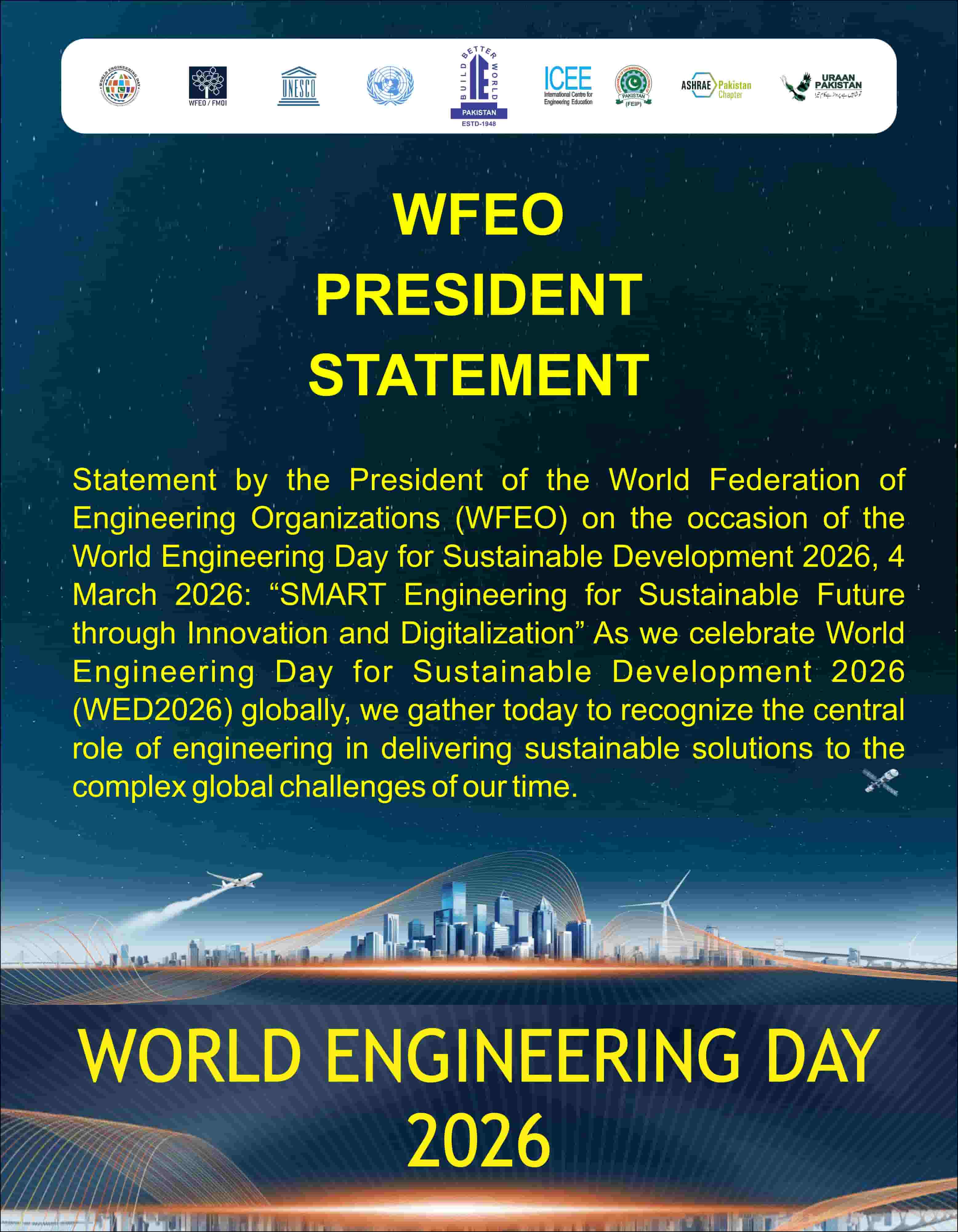 Statement by the President of the World Federation of Engineering Organizations (WFEO) on the occasion of the World Engineering Day for Sustainable Development 2026, 4 March 2026: “SMART Engineering for Sustainable Future through Innovation and Digitalization” As we celebrate World Engineering Day for Sustainable Development 2026 (WED 2026) globally, we gather today to recognize the central role of engineering in delivering sustainable solutions to the complex global challenges of our time. Proclaimed by UNESCO in 2019 and co-led by the World Federation of Engineering Organizations (WFEO), World Engineering Day for Sustainable Development has since grown into a truly global platform. Each year, it brings together engineering institutions, policymakers, innovators, educators, and leaders from around the world to reaffirm our shared commitment to building a better tomorrow through science, technology, and collaboration. However, beyond the global celebration, WED 2026 also marks a series of concrete steps designed to strengthen the global engineering community and its contribution to sustainable development. These include: 1) the launch of the WFEO Institute; 2) the establishment of the World Academy of Engineering: 3) a new initiative to support developing and small island countries facing sustainable development challenges; and 4) the signing of a Memorandum of Understanding with the International Research Center of Big Data for Sustainable Development Goals (CBAS). WED 2026 also reflects the outcomes of our Strategic Objectives, which reaffirmed WFEO’s priorities for the next decade (2026–2035) through 13 initiatives, including the WFEO Institute, the World Academy of Engineering, World Engineering Day, the WFEO Hackathon and the UNESCO Engineering Report. In this context, our partnership with UNESCO remains central. WFEO is committed to contributing to the third UNESCO Global Engineering Report, which will assess progress in aligning engineering with the SDGs, provide valuable insights into engineering trends and challenges, and support evidence-based policy and education frameworks. These priorities help coordinate action across our global network and for deeper collaboration with international partners. As President of WFEO, I call upon our members and partners to deepen collaboration, invest in the next generation of engineers, and uphold the highest professional and ethical standards. By working together across borders, we will ensure that engineering remains a driving force for sustainable development for present and future generations. Thank you to everyone. Happy World Engineering Day